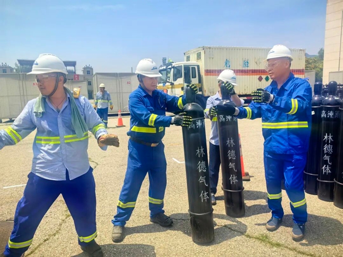 為了在規定時間完成相關任務,北普公司將全部人員分成若干工作小組,組長都是由多次參加重大活動保障任務的老員工擔任,小組的主要任務是在規定時間內將鋼瓶推放并綁定在指定位置,裝表、聯管、上槍、調壓,充氣作業,巡視、加壓、換瓶,一個個規范動作都責任到小組到個人,目標只有一個,配合協作單位在規定時間內完成罐裝,以最安全的方式、最快的速度將現場高純氦氣鋼瓶撤出,確保特制移動籠房能夠準時出發。